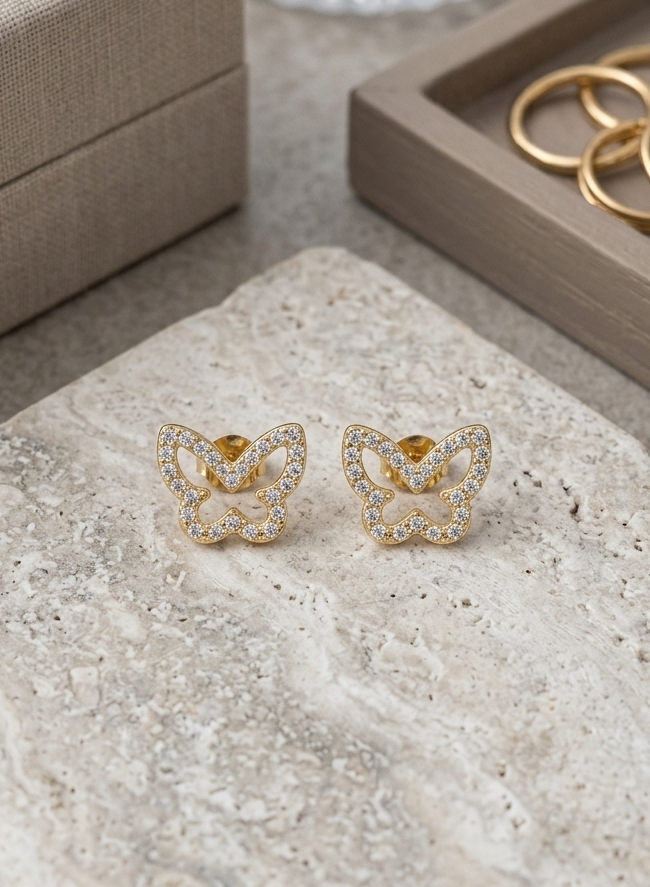Captura la esencia de la transformación y la libertad con estos encantadores pendientes. Diseñados con una silueta de mariposa en baño de oro, cada ala está meticulosamente adornada con cristales que reflejan la luz en cada movimiento. Una pieza delicada, femenina y llena de brillo, perfecta para añadir un toque de magia y elegancia a tu día a día.