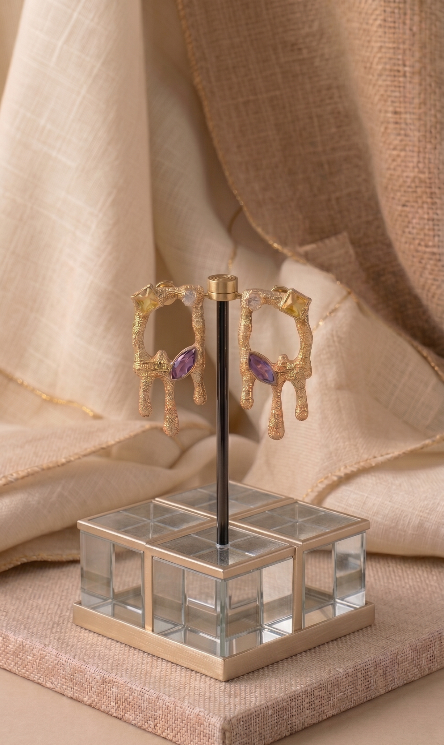 Modernidad y brillo en perfecta armonía. Los aretes geométricos con destellos violetas destacan por su diseño audaz y contemporáneo, donde las formas definidas se combinan con el encanto misterioso del violeta 💜. Cada destello aporta un toque de luz y sofisticación que transforma cualquier look al instante ✨.