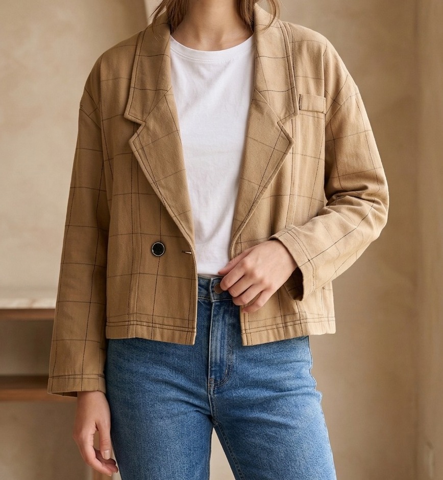 Eleva tu estilo con nuestra sofisticada Blusa Blazer Cambridge. Esta pieza única fusiona la ligereza de una blusa con la estructura y elegancia de una blazer corta, creando un diseño híbrido irresistible. En un cálido tono café tabaco con un sutil estampado de cuadros minimalistas, es la prenda ideal para un look de oficina impecable o para aportar un toque de distinción a tus conjuntos más casuales.