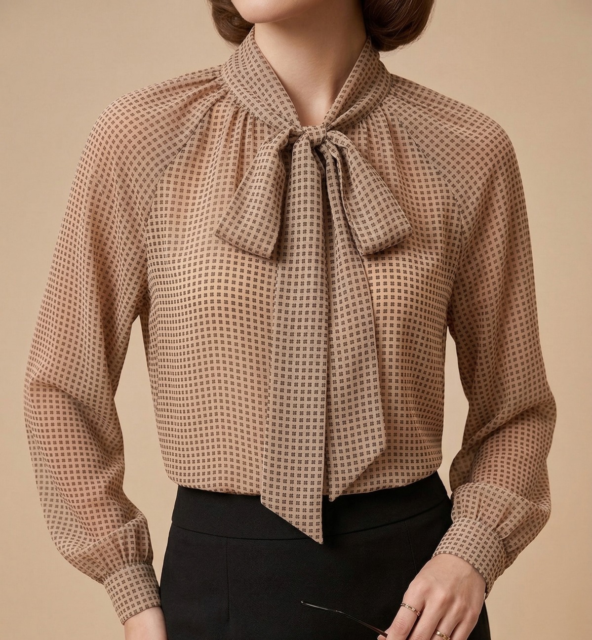📐 Micro Estampado Exclusivo: Un delicado patrón geométrico en tonos oscuros sobre una base beige neutro. Es sutil, elegante y muy fácil de combinar. 🤎