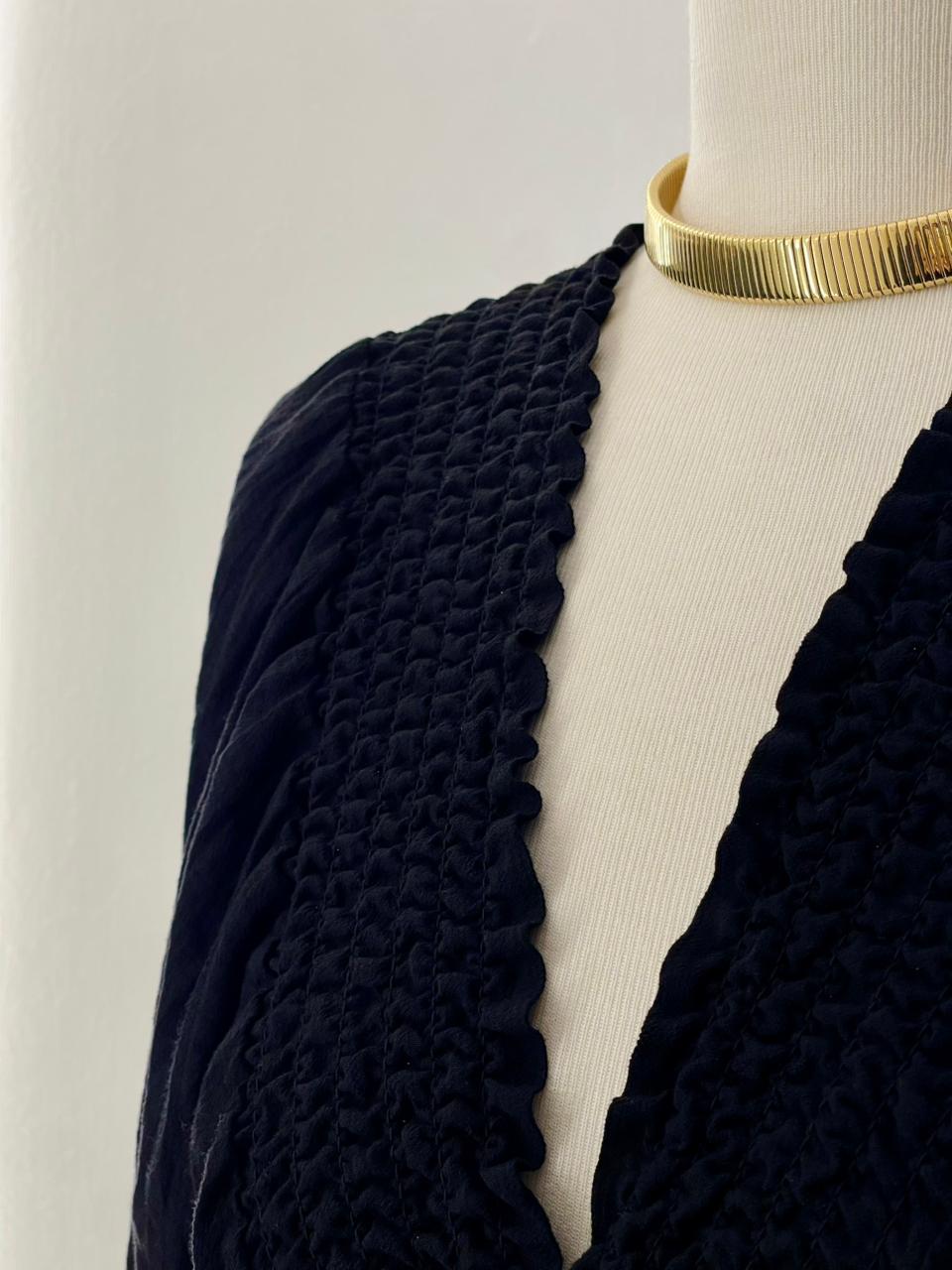 Esta blusa negra con escote en V destaca por sus delicados frunces, que aportan textura, feminidad y un toque de distinción. Su diseño favorecedor realza tu figura con elegancia, logrando un equilibrio perfecto entre sensualidad y clase 🌹