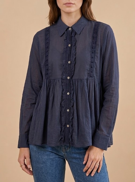 Captura todas las miradas con nuestra blusa Navy Romance, una pieza que combina la frescura de lo cotidiano con detalles artesanales de lujo. 🕊️ Confeccionada en un tejido ligero color azul medianoche, destaca por sus delicadas tiras de encaje floral bordado que recorren el torso y su romántico acabado de volantes a lo largo de la botonadura central. ✨🎀