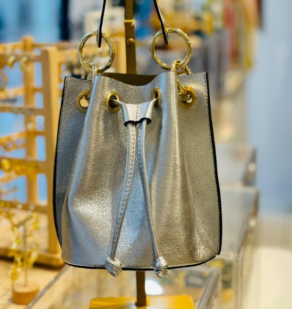 Estilo suave, diseño impactante. Este bolso gris tipo bucket combina elegancia y comodidad en un solo accesorio. Su acabado escarchado aporta un brillo sutil que destaca sin exagerar, y los detalles dorados le suman un toque de sofisticación.