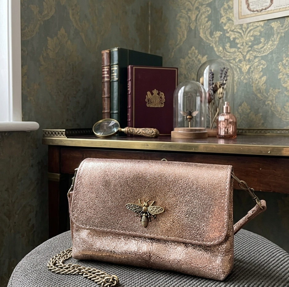 Elaborado con cuero italiano 100% genuino, este bolso destaca por su textura suave, resistencia y acabados premium. Su tono oro rosa metálico ofrece un estilo elegante y contemporáneo, perfecto para usar tanto en el día como en ocasiones especiales. 💫