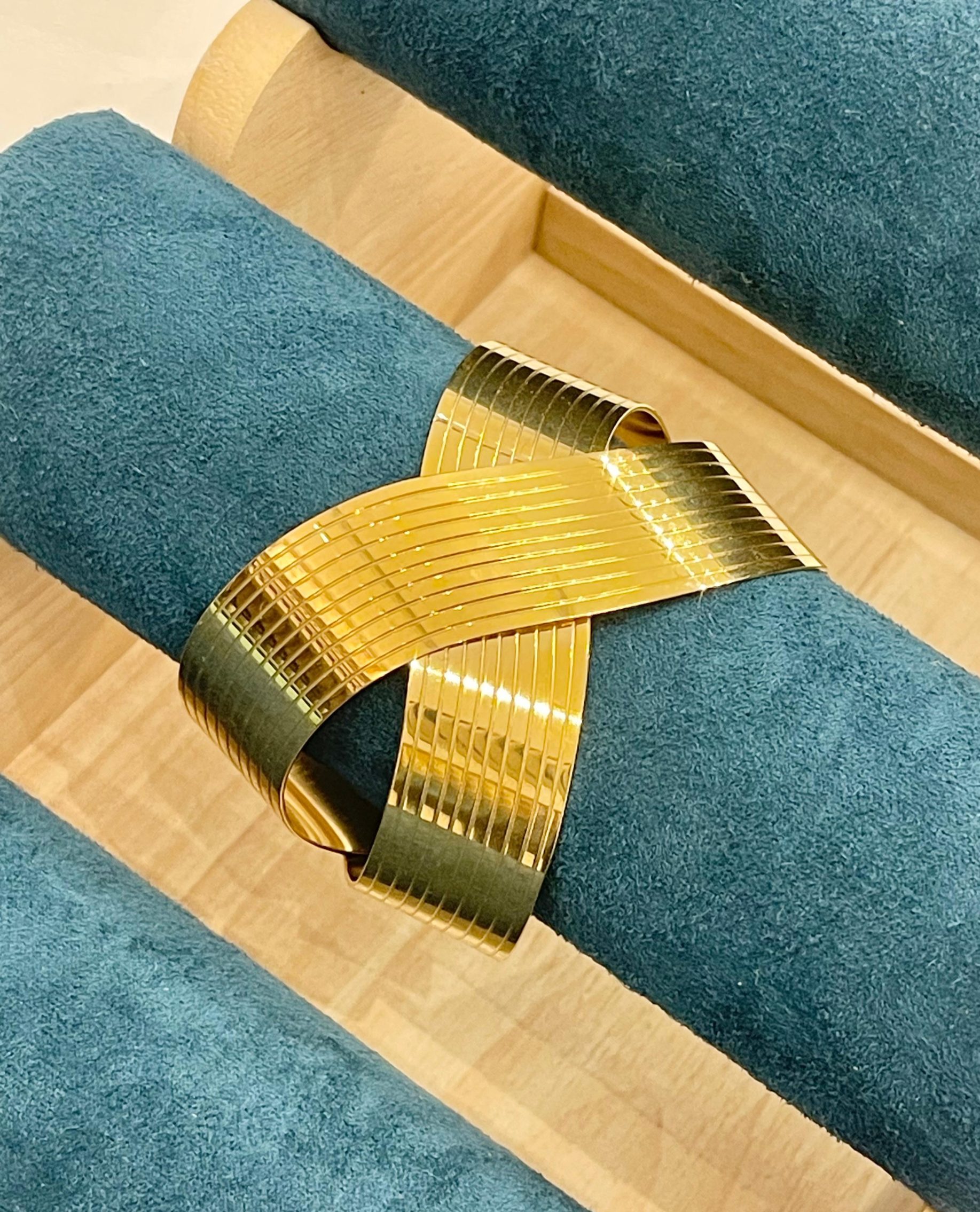 Una pulsera rígida de acero inoxidable bañada en oro de 24K, con un diseño cruzado que simboliza fuerza, equilibrio y estilo.