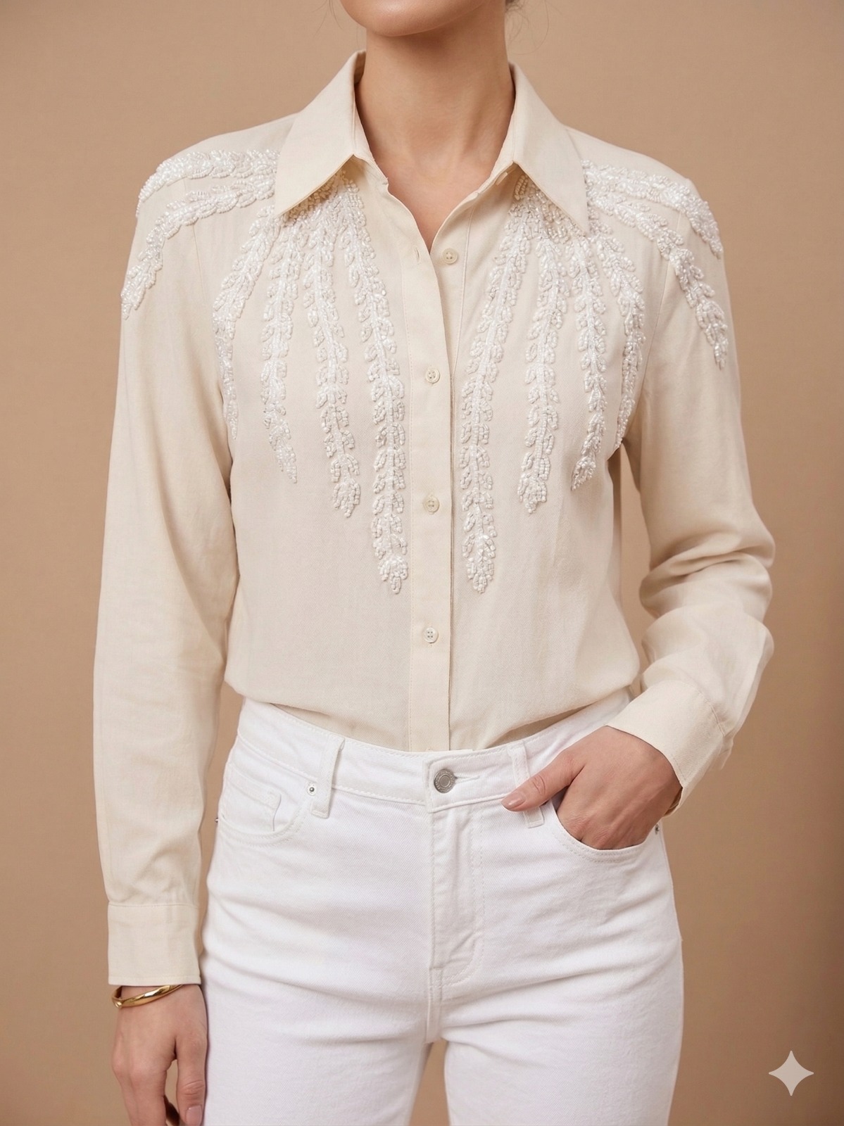 Descubre la elegancia y sofisticación en su máxima expresión con nuestra Camisa de Lino en tono Crema. Esta prenda ha sido meticulosamente diseñada con un impresionante bordado artesanal en perlas blancas, dispuesto en delicados motivos de hojas que se extienden desde los hombros hasta el frente, añadiendo un toque de lujo y distinción a cada outfit.