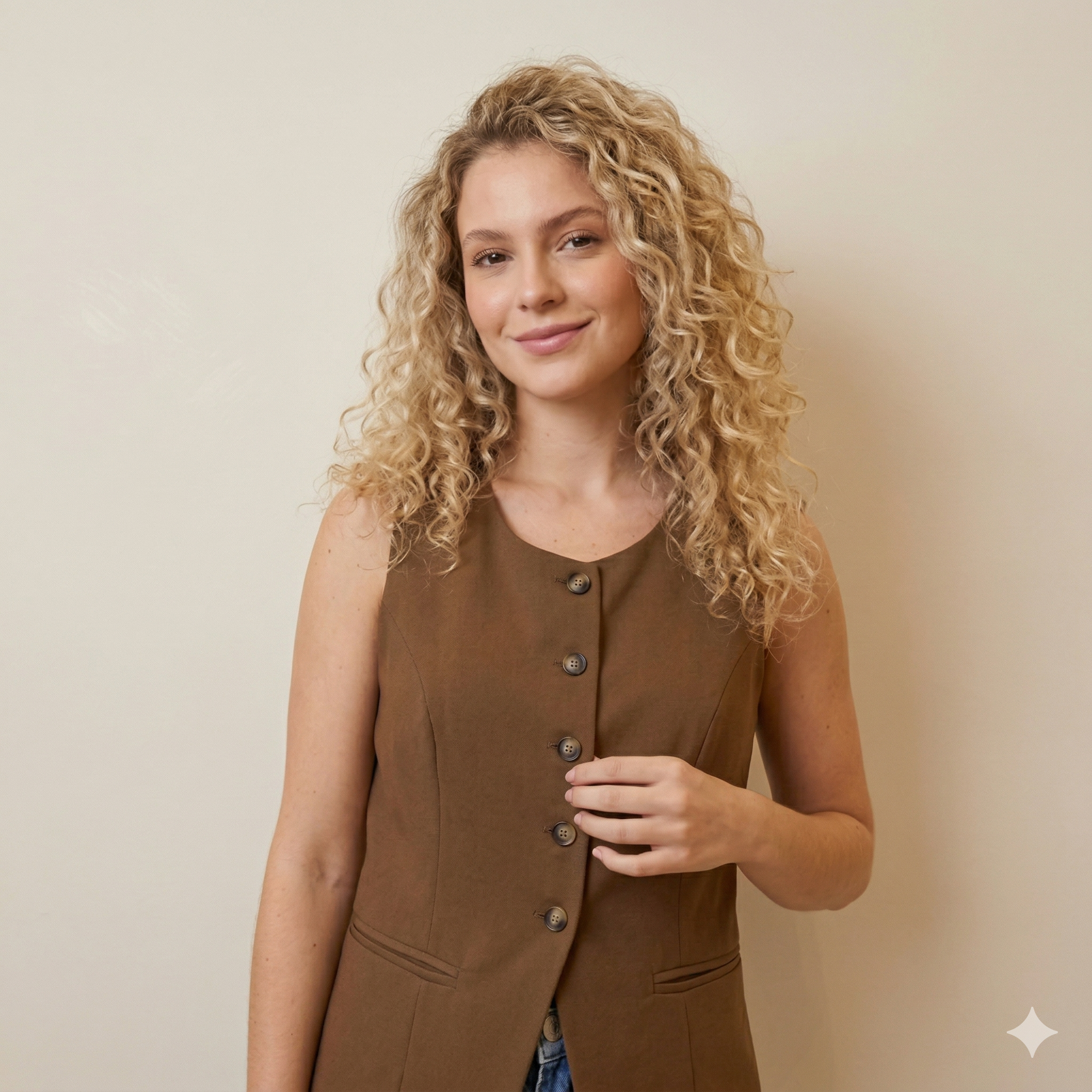 Un chaleco en tono café 🤎, elegante y versátil, perfecto para complementar cualquier outfit con un toque cálido y sofisticado. Ideal para crear looks modernos y con estilo ✨