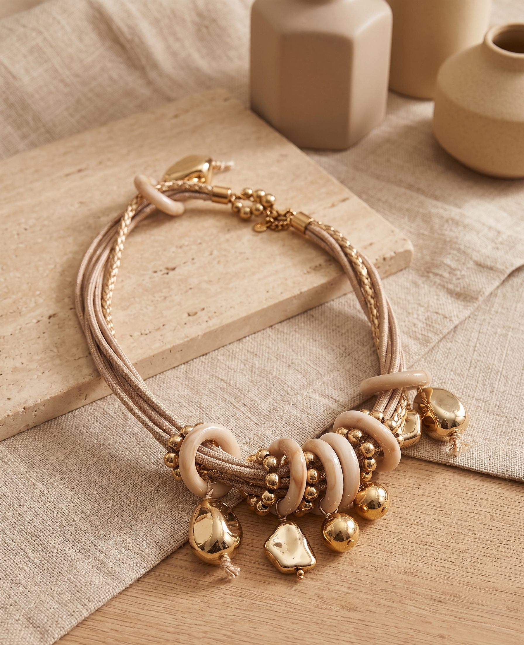 Sutileza y elegancia en perfecta armonía. El Collar Beige y Oro combina la calidez de los tonos neutros con el brillo sofisticado del dorado, creando una pieza delicada y atemporal 🤍. Su diseño suave y equilibrado aporta un toque de luz discreta que realza cualquier estilo con naturalidad ✨.