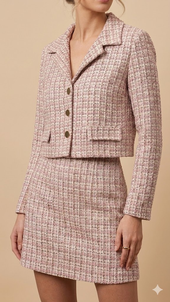 Eleva tus básicos de primavera con nuestro Conjunto Tweed Rose. 🎀 Confeccionado en un exquisito tejido de punto de tweed con hilos metalizados que aportan un brillo sutil y sofisticado. Su diseño de frente abierto se realza con un espectacular broche dorado en forma de sol, que funciona como el punto focal perfecto para un look iluminado. ✨☀️