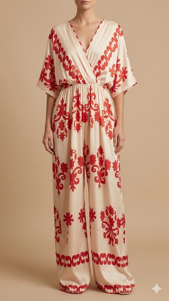 Siente la libertad y el lujo en una sola prenda con nuestro Jumpsuit Satín Boho Scarlet. 🕊️ Confeccionado en un tejido satinado de caída espectacular, este enterizo destaca por su vibrante estampado étnico en color rojo sobre un fondo crema suave. Su diseño de escote cruzado en “V”, mangas tipo kimono y pierna ancha extra fluida (palazzo) crea una silueta estilizada y llena de movimiento. ✨💃