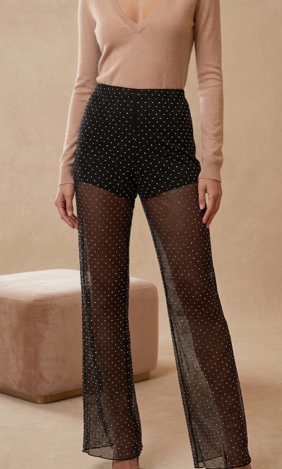 💃 ¡Prepárate para ser el centro de atención! 🤩 Estos pantalones de noche son pura sofisticación y glamour. Confeccionados en un elegante negro profundo, la parte superior de corte alto es cómoda y favorecedora.💎 Lo que los hace verdaderamente mágicos es la delicada malla de tul transparente que se extiende desde la parte superior del muslo hasta el suelo, cubriendo las piernas con una cascada de micro-cristales brillantes.