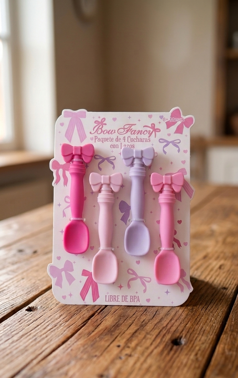 Un set de 4 cucharas con delicados detalles de lazos que combina ternura y practicidad 🎀 perfecto para acompañar la alimentación del bebé con un toque dulce y encantador. Su diseño suave y funcional hace que cada comida sea más especial ✨