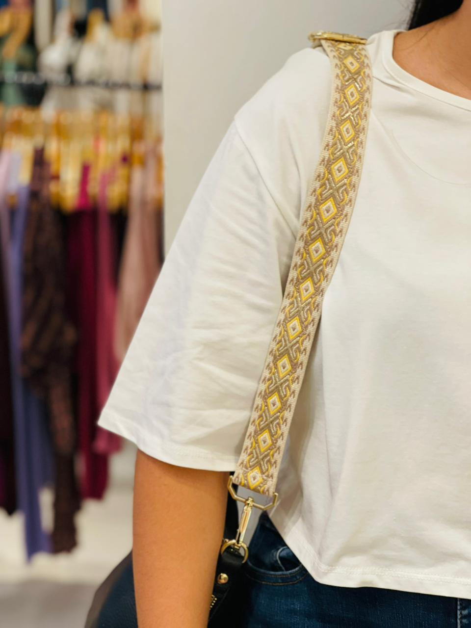 Su diseño geométrico en tonos amarillos y tierra refleja la calidez del sol y la esencia libre del estilo bohemio 🌿.