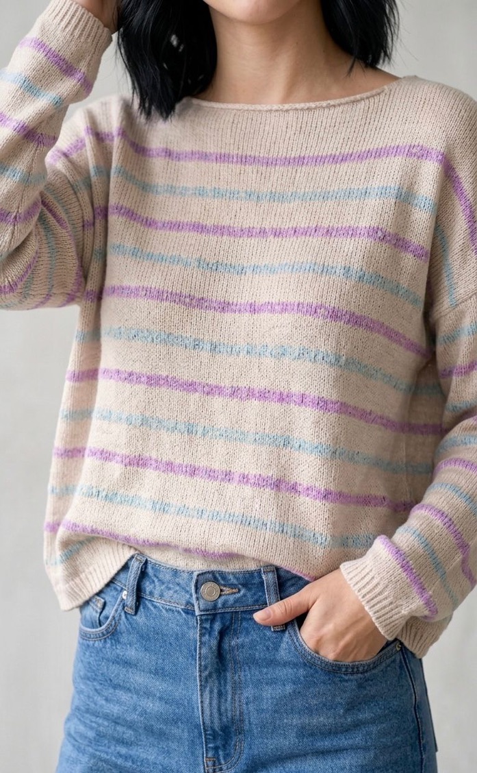 El Suéter Rayas Moradas y Celestes es una prenda suave y acogedora que combina tonos pastel llenos de encanto 💜✨. Su diseño a rayas en morado y celeste crea un look moderno, dulce y relajado, perfecto para aportar color sin perder la armonía 🌈🧶.