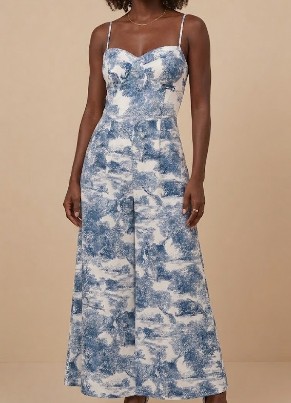 Déjate seducir por el encanto atemporal de nuestro Jumpsuit Toile de Jouy. 💙 Este enterizo combina la sofisticación de un estampado clásico francés con una silueta moderna y favorecedora. Destaca por su corpiño estructurado tipo corset con escote corazón y tirantes finos, que da paso a una pierna ancha (palazzo) con una caída fluida y ligera. ✨🌿