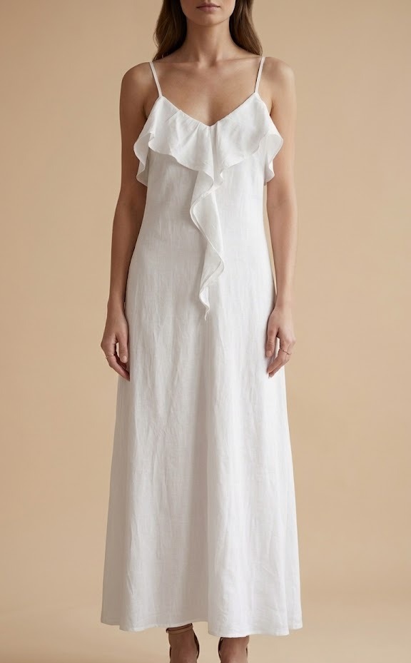 Siente la frescura y la sofisticación natural con nuestro vestido largo de lino blanco. Confeccionado en un tejido de lino premium que ofrece una transpirabilidad inigualable, este vestido destaca por su diseño de tirantes finos y un escote en “V” adornado con un delicado volante que cae suavemente por el torso. Su silueta fluida y relajada crea un movimiento etéreo y cómodo. ✨🕊️